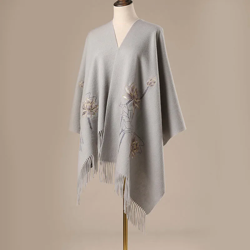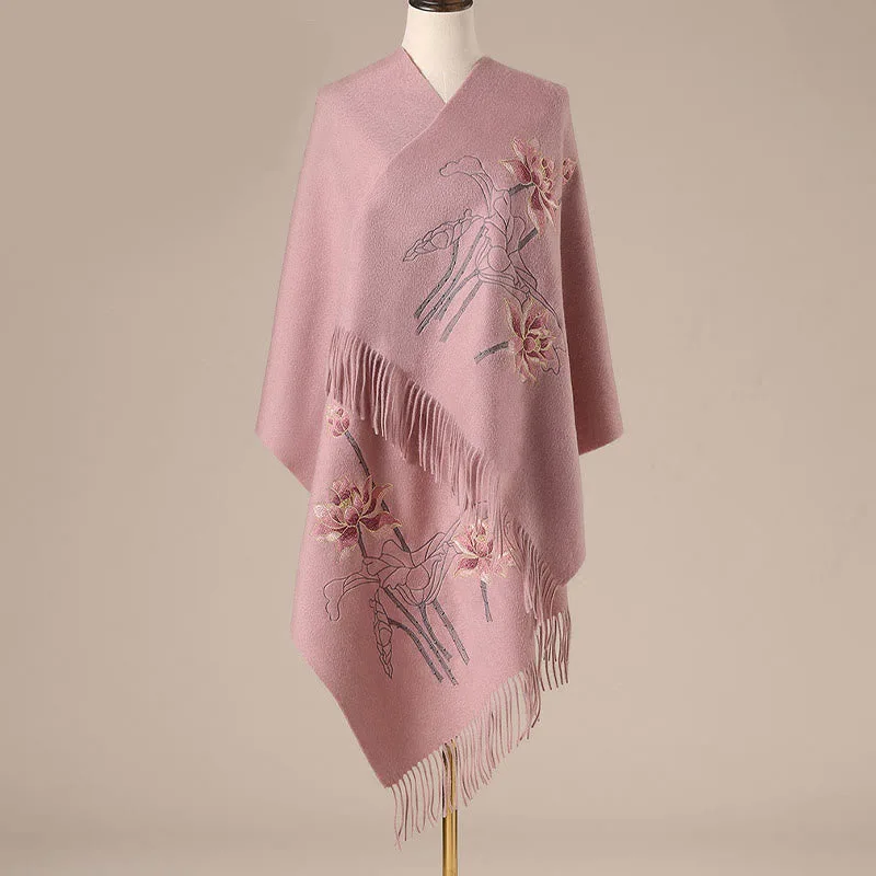 Lotus Embroidery Wool Shawl features intricate lotus designs that symbolize purity and serenity. Made from soft wool. it provides warmth and comfort during winter. The tasseled edges add a delicate touch. while the meaningful embroidery makes it a perfect choice for mindfulness and inner peace. A versatile wrap for moments of tranquility.