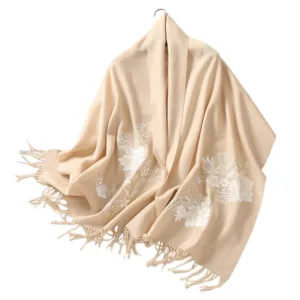 White Flower Embroidery Wool Shawl with White Flower Embroidery offers warmth and comfort with its soft wool material. The intricate white flower embroidery adds a touch of elegance and peace. making it a perfect addition to your winter accessories. The tassel design provides a delicate finish. while the shawl’s cozy feel ensures relaxation during travel or colder days.
