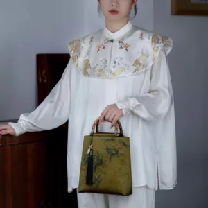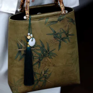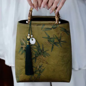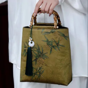 Yellow Green Bamboo Leaves handbag features elegant bamboo leaf patterns and unique bamboo handles. This stylish handbag blends natural beauty with practical design. making it perfect for both everyday use and special occasions. The combination of yellow and green hues with bamboo accents adds a touch of nature-inspired charm. enhancing your attire with its sophisticated appeal.