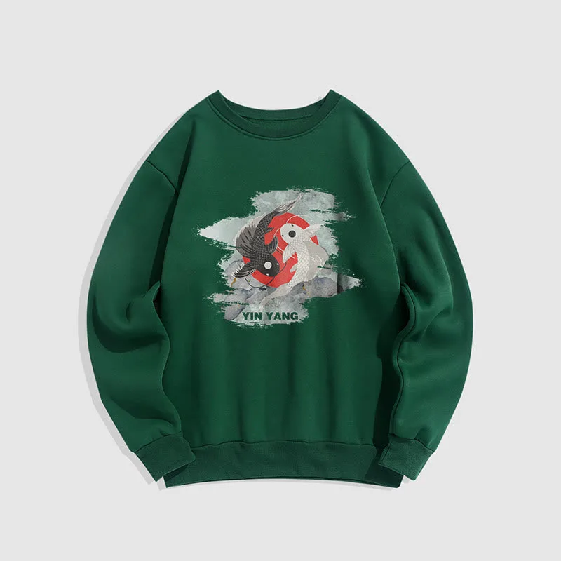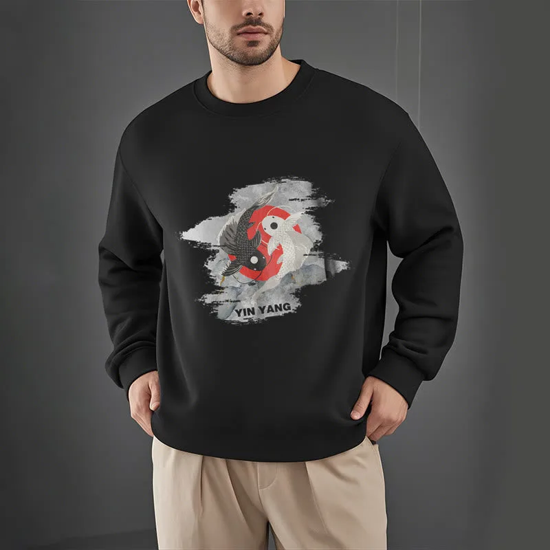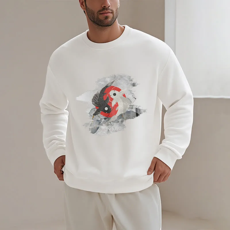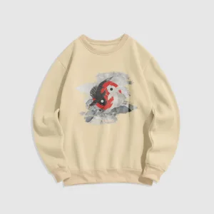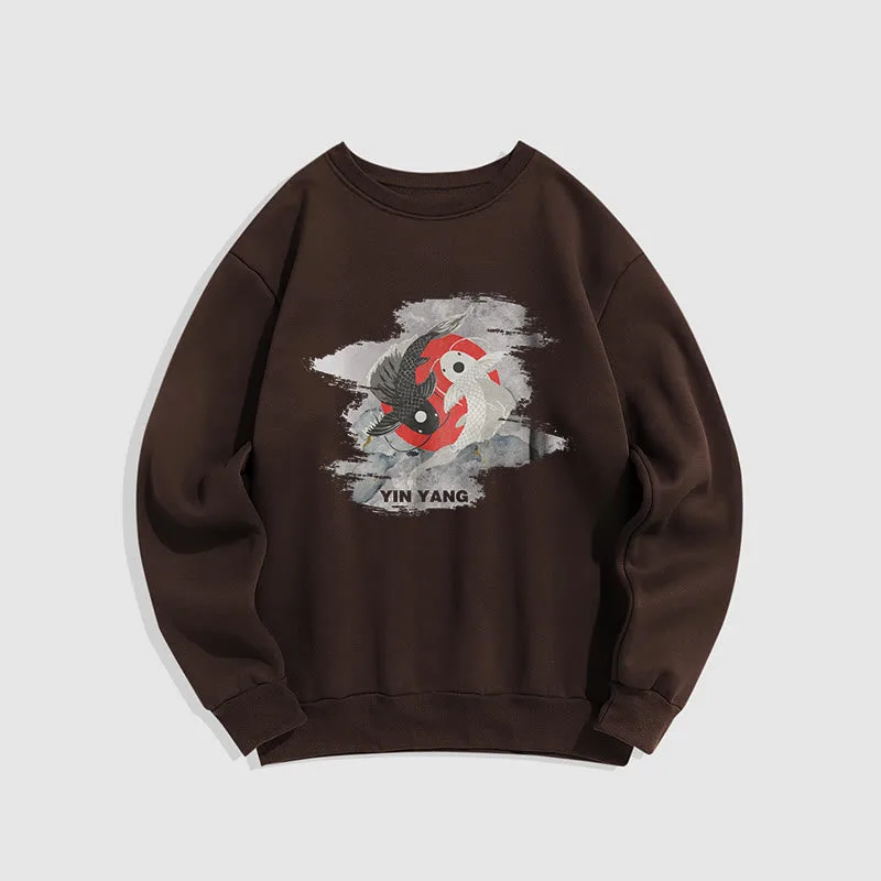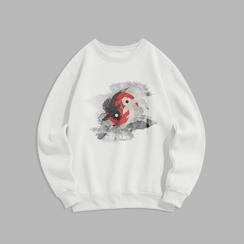 - DESIGN INSPIRATION: The Sweatshirt features a yin-yang symbol intertwined with koi fish. representing harmony and balance in life’s dualities. as well as perseverance and transformation.