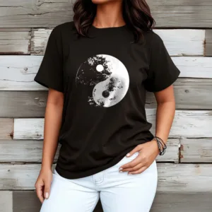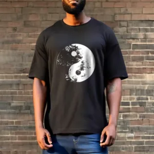 - DESIGN INSPIRATION: This T-Shirt features a stylized Yin Yang symbol. depicted with a textured and artistic flair. It represents the balance of opposing forces. highlighting the importance of harmony and duality in life.