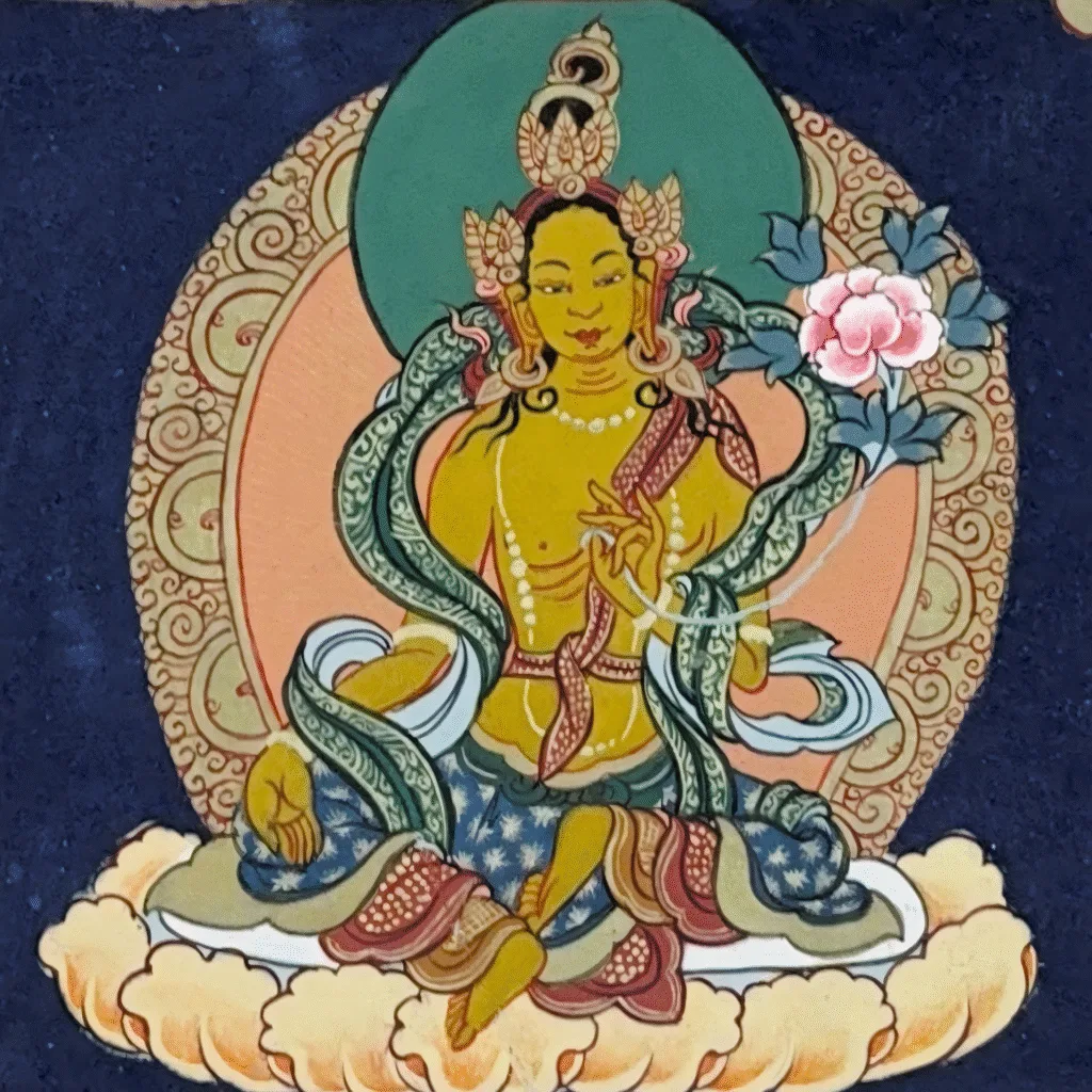 This sacred necklace, crafted to counter the core affliction of ignorance and delusion, is a divine remedy. The golden-yellow Tara embodies wisdom and abundance, awakening fundamental insight, dispelling ignorance, and guiding you to the truth of dependent origination and emptiness.